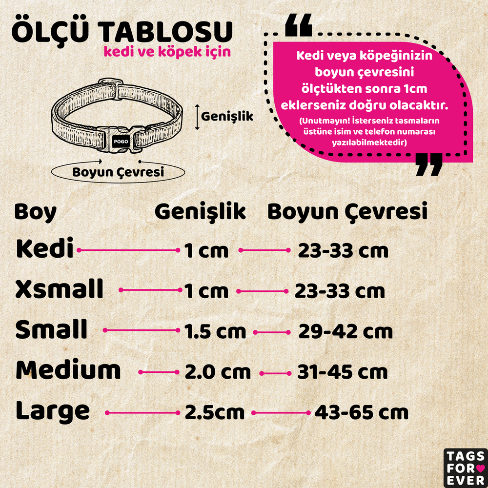 Ek ücret ödemeden tasmanın direkt üstüne isim ve telefon numarası yazdırma imkanı sağlanmaktadır. Sallantılı künye sevmeyenler için mükemmel bir çözümdür; tasmanın üstüne yazılan bilgiler sayesinde kaybolmalara son verilir. Tamamıyla kişiye özel üretim olan bu tasma, köpeğinizin benzersizliğini yansıtır.